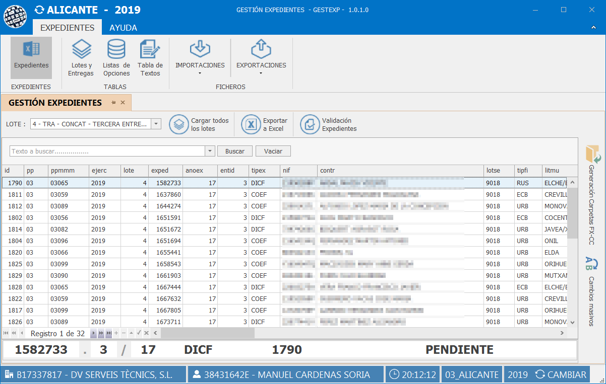 La base de datos se genera a partir de la carga del fichero CSV que se descarga en la consulta de expedientes en SIGECA. Se pueden cargar expedientes de cualquier gerencia. Los expedientes se organizan en lotes de entrada, lotes de trabajo y lotes de entrega;